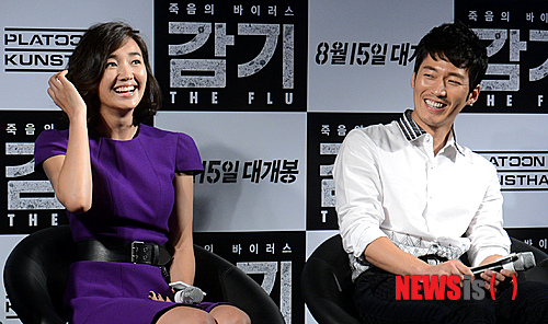 【서울=뉴시스】박상훈 기자 = 22일 오후 서울 강남구 논현동 플래툰 쿤스트할레에서 열린 영화 '감기' 쇼케이스에서 수애, 장혁이 활짝 웃고 있다. 2013.07.22.