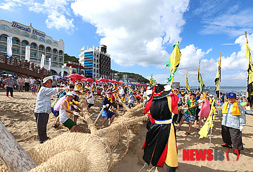 【당진=뉴시스】이진영 기자 = 지난 3일부터 4일까지 이틀 동안 충남 당진시 왜목마을에서 펼쳐진 ‘해와 달의 만남 당진愛 바다불꽃축제’의 부대행사로 열린 당진기지기 줄다리기 체험행사에 참여한 주민과 전국에서 찾아온 관광객들이 줄을 당기며 체험을 즐기고 있다. 2013.08.04. (사진= 당진시 제공)