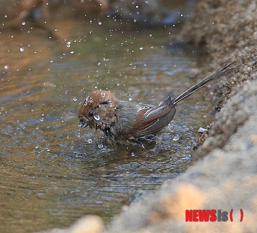 【창원=뉴시스】김해연 기자 = 폭염이 이어진 가운데 경남 창원 주남저수지 인근 하천에서 더위를 식히고 있는 붉은머리 오목눈이 한마리가 11일 카메라에 잡혔다. 2013.08.12.(사진=생태사진가 최종수)
