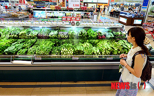 【서울=뉴시스】 박문호 기자 =장마에 이은 불볕더위로 배추 등 채소류 가격이 폭등한 16일 오후 서울 한 대형마트에서 고객이 채소코너를 지나고 있다. 2013.08.16.