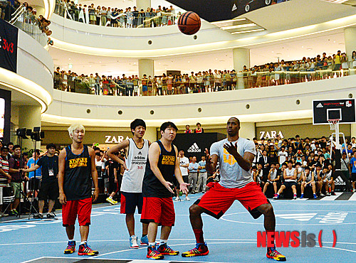 【서울=뉴시스】 박문호 기자 = 드와이트 하워드(휴스턴 로키츠, 센터) 선수가 18일 오후 서울 영등포 타임스퀘어 아트리움에서 열린 ‘드와이트 타임 - NBA 최고 센터 드와이트 하워드 선수 vs 하하&정형돈의 농구 대결’에서 선공을 정하기 위해 공을 던지고 있다. 2013.08.18.