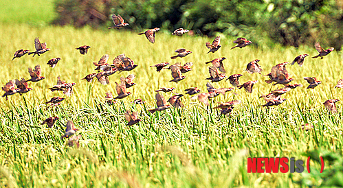【김포=뉴시스】이종철 기자 = 신선한 가을을 맞이한다는 처서(處暑)를 사흘 앞둔 20일 오후 경기 김포 사우동 들녘에서 벼가 노랗게 익어가는 가운데 참새들이 살을 찌우기 위해 떼를 지어 날아다니고 있다. 2013.08.20