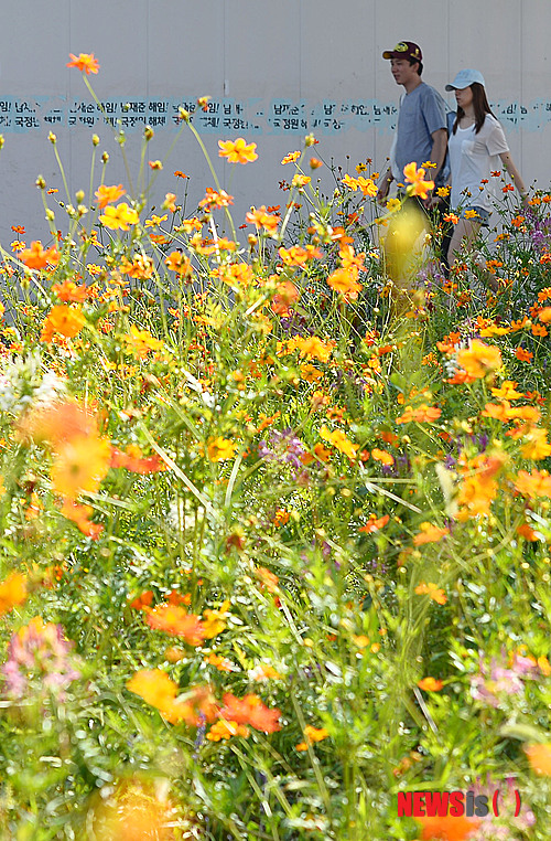 【서울=뉴시스】박동욱 기자 = 전국이 대체로 맑은 날씨를 보인 25일 오후 서울 성동구 서울숲에서 시민들이 황하코스모스 등 꽃이 핀 산책로를 걷고 있다. 2013.08.25.