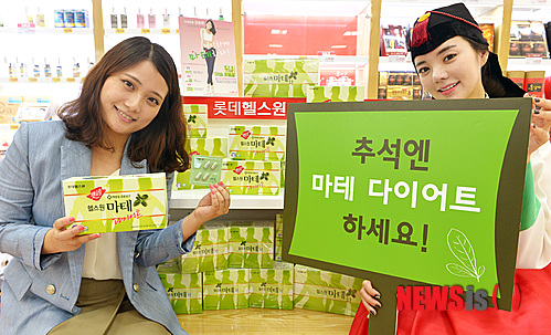 【서울=뉴시스】강진형 기자 = 11일 오전 서울 구로구 롯데마트 구로점에서 모델들이 롯데 헬스원 '마테 다이어트'를 선보이고 있다. 롯데 헬스원은 기름진 음식을 많이 먹게 되는 추석을 맞아 롯데마트 및 이마트 등 전국 157개 유통점에서 다이어트 제품인 '마테 다이어트'를 포함한 선물세트를 최대 20%까지 할인 판매한다. 2013.09.11.