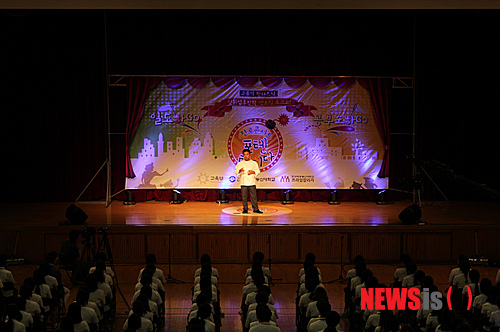 【서울=뉴시스】박효남 밀레니엄 서울호텔 상무가 13일 오후 서울 구로구 서서울생활과학고등학교에서 한국방송통신대 프라임칼리지(부총장 겸 학장 이동국)가 주최하는 진로콘서트 '포텐터지다'에 참석해 '극복'을 주제로 강연을 하고 있다. 2013.09.13. (사진=한국방송통신대학교 제공)