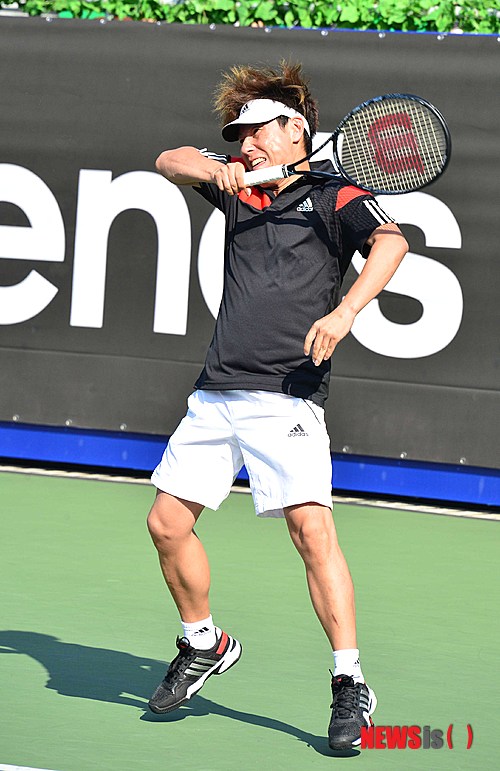 【서울=뉴시스】고승민 인턴기자 = 가수 윤종신이 15일 오후 서울 송파구 방이동 올림픽공원 테니스센터 코트에서 열린 ‘마리아 키릴렌코와의 아디다스 프렌즈 매치'에서 포핸드 동작으로 공을 받아치고 있다. 2013.09.15.