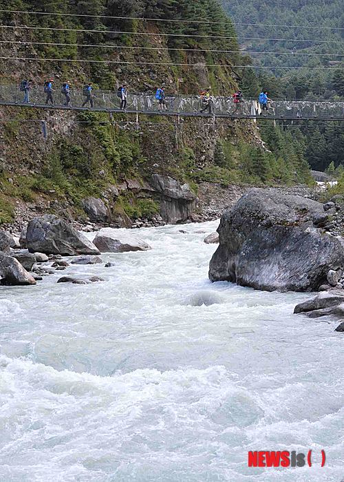 【남체(네팔)=뉴시스】임영주 특파원 = “뉴시스 창사 12주년, ‘꿈을 향한 도전’ 2013 히말라야 로체 남벽(8516m) 대한민국 원정대”홍성택 대장이 이끄는 로체남벽원정대가 카라반 첫날인 17일(현지시각) 에베레스트와 초오유에서 발원해 흐르는 두두코시강을 건너 베이스캠프를 향해 카라반을 하고 있다.