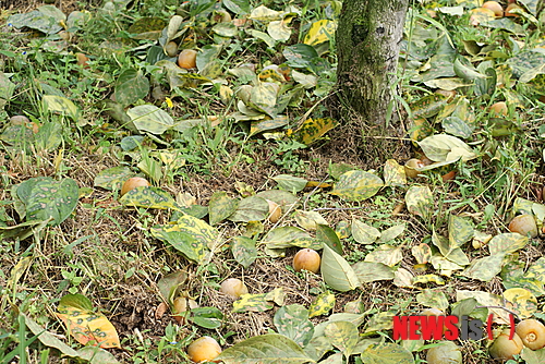 【상주=뉴시스】박홍식 기자 = 경북 상주지역에 최근 감나무 잎과 과일이 떨어지는 급성형 둥근무늬낙엽병이 급속히 확산되면서 피해 방지에 비상이 걸렸다. 지난 17일 상주 외서면 한 농가 감나무 잎이 떨어져 있다. 2013.09.18 (사진=상주시 제공)