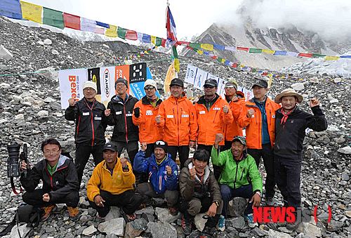 【로체 BC(네팔)=뉴시스】임영주 기자 = “뉴시스 창사 12주년, ‘꿈을 향한 도전’ 2013 히말라야 로체 남벽(8516m) 대한민국 원정대”홍성택 대장이 이끄는 로체남벽원정대와 세르파들이 24일(현지시각) 오전 로체 베이스캠프(5300미터)에서 대원들의 안전 기원과 성공 등반을 위한 라마제를 지낸뒤 기념촬영하고 있다.