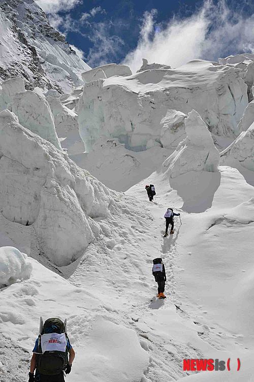 【로체 BC(네팔)=뉴시스】임영주 기자 = “뉴시스 창사 12주년, ‘꿈을 향한 도전’ 2013 히말라야 로체 남벽(8516m) 대한민국 원정대”홍성택 대장이 이끄는 로체남벽원정대가 26일(현지시각) 이틀째 제1 캠프를 구축하기 위해 아이스폴 지역 세락과 크레바스를 통과해 등반 전진하고 있다.