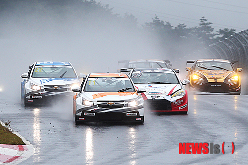 【서울=뉴시스】한국지엠주식회사(이하 한국지엠)의 쉐보레 레이싱팀이 지난 29일 강원도 인제 스피디움에서 열린 '2013 CJ헬로비전 슈퍼레이스 챔피언십' 6라운드에서 우승을 차지했다. 사진은 쉐보레 레이싱팀과 참가 선수들이 열띤 경기를 펼치는 모습. 2013.09.30. (사진=한국지엠 제공)