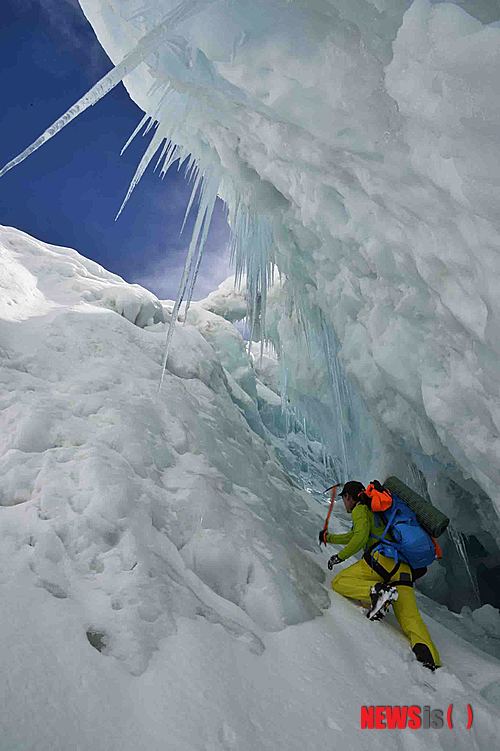 【로체 캠프1(네팔)=뉴시스】임영주 기자 =  로체원정대 “뉴시스 창사 12주년, ‘꿈을 향한 도전’ 2013 히말라야 로체 남벽(8516m) 대한민국 원정대” 홍성택 대장이 30일(현지시각)  캠프2(6500미터)를 구축하기위해 아이스폴 지대를 돌파하고 있다.