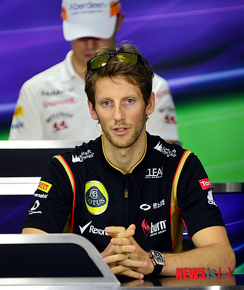 【영암=뉴시스】류형근 기자 = 3일 오후 전남 영암군 삼호읍 코리아 인터네셔널 서킷에서 포뮬러원(F1) 코리아 그랑프리에 참가한 드라이버 공동기자회견이 열린 가운데 시즌 포인트 57점으로 8위를 달리고 있는 로망 그로장이 포부를 밝히고 있다. 2013.10.03.