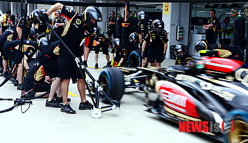 【영암=뉴시스】류형근 기자 = 6일 오후 전남 영암군 삼호읍 코리아 인터네셔널 서킷의 피트에서 로터스의 미캐닉이 포뮬러원(F1) 코리아 결승을 앞두고 타이어 교체 훈련을 하고 있다. 2013.10.06.