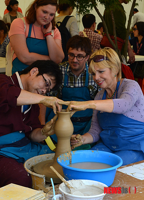 이천 도자기 축제에서 도자 빚기 체험하는 외국인들