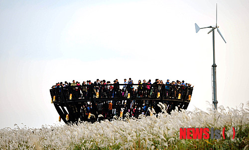 【서울=뉴시스】 박문호 기자 = 20일 오후 서울 마포구 상암동 하늘공원에서 열린 ‘제12회 서울 억새 축제’를 찾은 많은 시민이 조형물 '하늘을 담는 그릇'에 올라 가을의 정취를 만끽하고 있다. 2013.10.20.