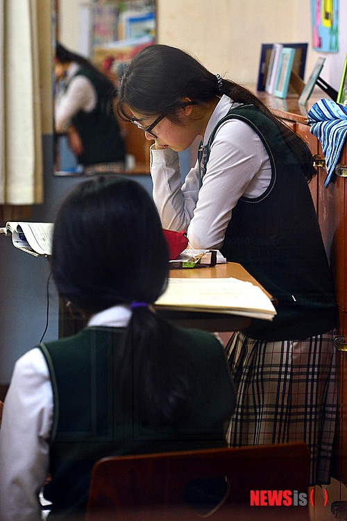 【서울=뉴시스】박찬수 기자 = 2014학년도 대학수학능력시험을 이틀 앞둔 5일 오후 서울 종로구 필운동 배화여자고등학교 3학년 학생들이 교실에서 공부를 하고 있다. 2013.11.05.