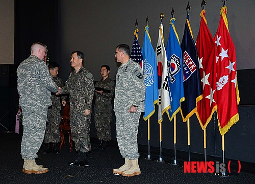 【서울=뉴시스】고승민 기자 = 7일 오전 서울 한미연합사 다목적극장에서 열린 한미연합사령부 창설 35주년 기념행사에서 박선우 한미연합사령부 부사령관이 미군 간부에게 표창 수여를 하고 악수를 하고 있다. 2013.11.07.