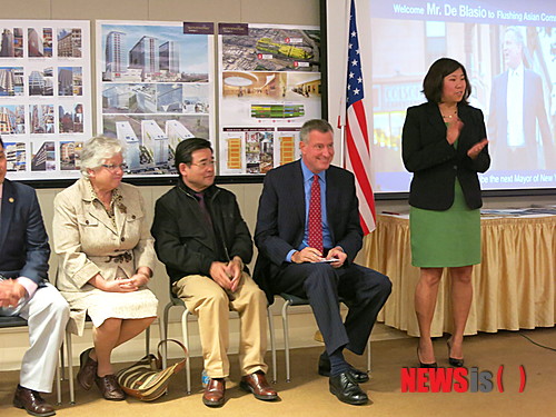 【뉴욕=뉴시스】노창현 특파원 = 뉴욕시의 새로운 수장으로 탄생한 빌 드블라지오 뉴욕시장 당선자의 선거캠페인 과정에서 중국커뮤니티가 한인사회를 들러리로 세워 뒤늦은 논란이 일고 있다. 선거캠페인 기간동안 드블라지오 후보를 한번도 만나지 못한 한인사회는 선거를 열흘여 앞둔 지난달 24일 중국계인 그레이스 맹 연방의원이 한중커뮤니티를 위해 주선한 비공개 간담회를 주선했을 때 일부 인사들이 참석했지만 “한인사회를 중국계의 들러리로 삼았다”고 불쾌해 했다. 사진은 지난달 24일 비공개간담회장의 드블라지오 후보(오른쪽 두번째)와 그레이스 맹 의원. 2013.11.08. <사진=Newsroh.com 제공>