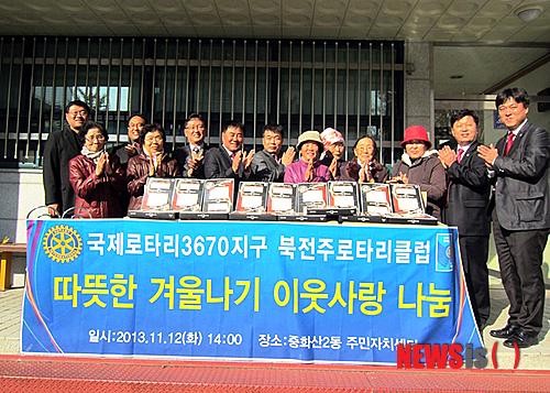 【전주=뉴시스】유영수 기자 = 북전주로타리클럽 서봉열 회장 등 회원들은 12일 전북 전주시 중화산 2동사무소를 방문해 겨울을 맞아 어렵고 소외된 독거노인에게 내복 100벌을 전달했다.2013.11.12.(사진=전주시청 제공)