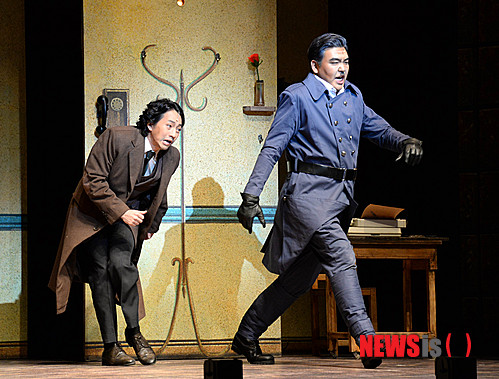 【서울=뉴시스】김진아 기자 =19일 오후 서울 종로구 연건동 홍익대 대학로 아트센터에서 진행된 뮤지컬 '벽을 뚫는 남자' 프레스콜에서 배우 마이클리(왼쪽)가 공연을 펼치고 있다.