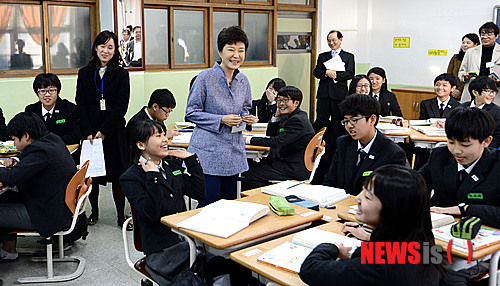 【서울=뉴시스】홍찬선 기자 = 박근혜 대통령이 21일 오후 자유학기제 연구학교인 서울 동작구 사당동 동작중학교를 방문해 학생들의 수업을 참관하고 있다. 2013.11.21.
