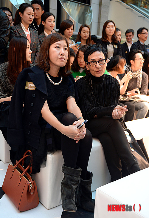 【상하이=뉴시스】조성봉 기자 = 23일 오후 중국 상하이 쉬자후이 강후이광장에서 열린 루이까또즈 상하이 그랜드게이트웨이66매장 오픈 기념행사에 참석한 매거진 더블유 코리아 이혜주(왼쪽) 편집장과 루이까또즈 실비 하다드 수석 디자이너가 패션쇼를 감상하고 있다. 2013.11.23.