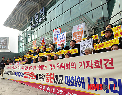 【서울=뉴시스】 박문호 기자 = 4일 오전 서울 중구 봉래동 서울역사 앞에서 철도 민영화 반대 각계 원탁회의를 마친 시민사회단체와 국회의원, 종교계·학계 인사 등 참가자들이 ‘철도파업예고에 따른 기자회견’을 하고 있다.