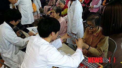 【울산=뉴시스】고은희 기자 = 13일 오후 울산 중구 성안동 늘푸른 노인요양원에서 춘해보건대(총장 김희진) 안경광학과 봉사동아리 '아이보리'가 어르신을 대상으로 무료 시력검안과 돋보기를 맞춰드리는 봉사활동을 펼치고 있다. 2013.12.13. (사진=춘해보건대 제공)