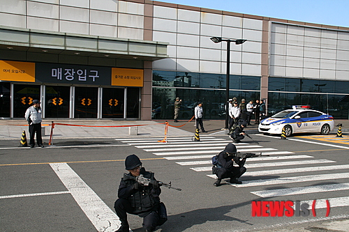 【영천=뉴시스】김재원 기자 = 경북 영천경찰서(서장 김훈찬)는 지난 13일 E마트 영천점에서 영천시, 영천소방서, 영천대대, 제2탄약창 등과 유관기관 합동 대테러 훈련을 실시했다. 이날 훈련은 국내외 사제폭발물 테러사건과 관련해 실제 있을지도 모르는 다중이용시설을 대상으로 한 폭발물 설치상황을 가정해 테러대응능력 향상을 위해 실시됐다. 2013.12.14 (사진= 영천경찰서 제공)