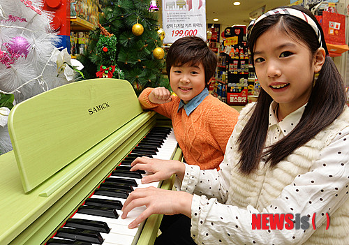 【서울=뉴시스】 박문호 기자 = 17일 오전 서울 중구 봉래동 롯데마트 서울역점 문구매장에서 아이들이 시중가보다 33% 저렴한 삼익 디지털 키즈 피아노 연주를 시연하고 있다. 친환경 목재를 사용해 인체에 무해한 이 키즈 피아노는 3세부터 초등학생까지 사용이 가능한 미니 사이즈 디지털 피아노로 볼륨 조절 기능이 있어 조용한 연주도 가능하다. 2013.12.17.