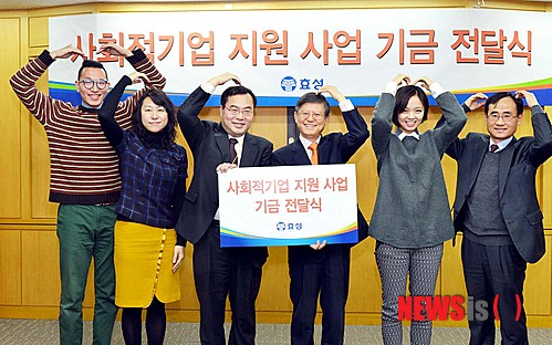 【서울=뉴시스】효성은 서울 마포구 공덕동 본사에서 장형옥 인사총괄부사장(오른쪽 세번째)과 함께일하는재단 정태길 사무국장(왼쪽 세번째)이 참석한 가운데 ‘사회적기업 지원사업 기금 전달식’을 개최했다고 20일 전했다. 2013.12.20. (사진=효성 제공)
