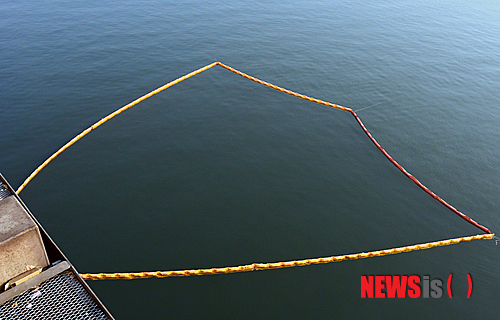 【서울=뉴시스】조성봉 기자 = 서울 성수대교 남단 한강에서 기름이 유출된 가운데 21일 오전 서울 성수대교 남단에 오일펜스가 설치되어있다.