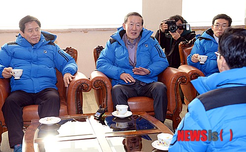 【서울=뉴시스】박영태 기자 = 10일 오전 서울 노원구 태릉선수촌에서 열린 허창수 전국경제인연합회 회장의 소치동계올림픽 선수단 격려식에서 허창수 회장(가운데)가 김재열 소치동계올림픽 선수단장과 이야기를 나누고 있다. 2014.01.10.