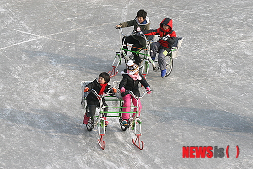 【화천=뉴시스】한윤식 기자 = 21일 오후 강원 화천 산천어축제가 연일 성황을 이루고 있는 가운데 축제장은 찾은 어린이들이 얼음자전거를 타며 즐거워하고 있다 2014.01.21.