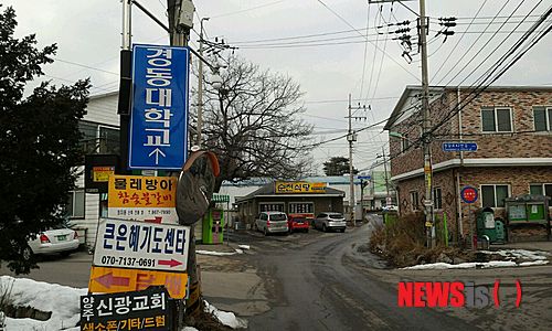 【양주=뉴시스】이종구 기자 = 경동대 양주캠퍼스의 진입도로 공사가 예산확보가 늦어지는 바람에 3월 개교 이전에 전체 공정을 마무리하지 못해 불편이 예상된다. 27일 학교로 들어가는 마을 도로에 경동대 입간판에 걸려 있다. 2014.01.27