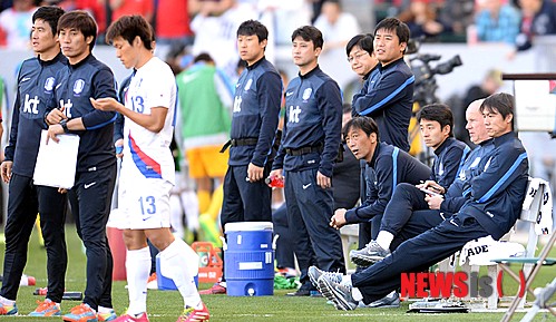 【카슨(미국)=뉴시스】박영태 기자 = 2일 오전(한국시각) 미국 캘리포니아주 카슨의 스텁 허브센터에서 진행된 한국 축구국가대표팀과 미국 축구국가대표팀의 평가전에서 한국 홍명보 감독이 앉아서 경기를 관전하고 있다. 2014.02.02.