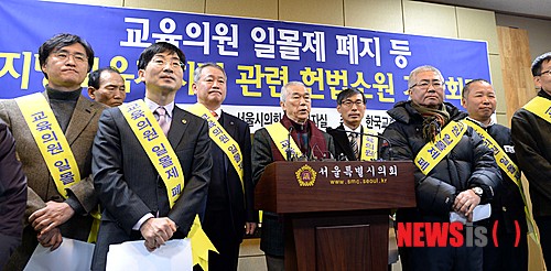 교육계는 기자회견을 통해 교육자치의 황폐화를 막고 교육의원을 유지시킬 수 있는 최종적 수단으로 일몰제 조항의 헌법소원심판을 청구, 일몰제로 지방선거가 치뤄질 경우 초래될 교육자치의 혼란을 막기위해 헌법소원과 함께 최종적 심판이 나올 때까지 일몰제 조항의 효력정지 가처분신청을 청구한다 밝혔다. 2014.02.10.