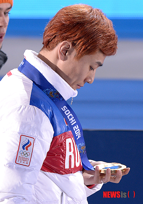 【소치(러시아)=뉴시스】김인철 기자 = 남자 쇼트트랙 1500M에서 금메달을 획득한 안현수(러시아명 빅토르 안)가 15일 오후(현지시각) 러시아 소치 해안클러스터 올림픽파크 메달프라자에서 열린 메달 세리머니를 마치고 퇴장하며 금메달을 바라보고 있다. 2014.02.16.