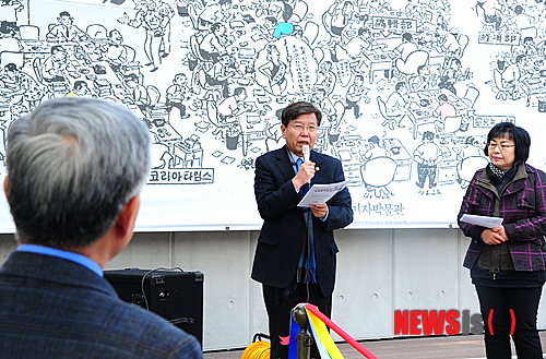 【영월=뉴시스】홍춘봉 기자 = 21일 영월군 한반도면 영월미디어기자박물관 야외전시장에서 ‘영월사랑-시니어사진신문만들기’ 교육생이 8개월간 학습한 신문만들기 작품전 개막식이 열렸다.