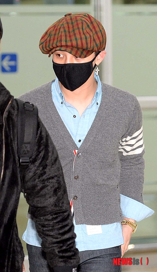 지드래곤, 베레모와 검정 마스크 착용하고 귀국