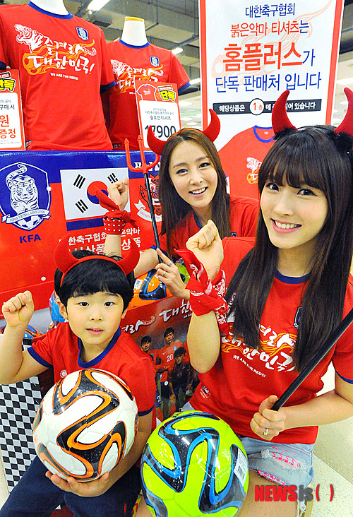 【서울=뉴시스】3일 서울 홈플러스 영등포점에서 모델들이 '2014 브라질 대한축구협회/붉은악마 공식 슬로건 티셔츠'를 선보이고 있다.