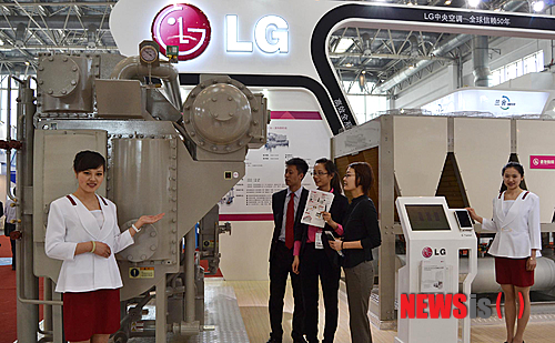 【서울=뉴시스】LG전자가 9일 중국 베이징에서 열린 '중국제냉전(中國制冷展, China Refrigeration) 2014’에 참가해 공항·쇼핑몰 등 대형 시설에 적합한 냉난방 시스템인 칠러 라인업을 소개하고 있다. 2014.04.09. (사진=LG전자 제공)