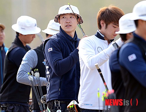 【인천=뉴시스】박영태 기자 = 9일 오후 인천광역시 계양 아시아드 양궁장에서 진행된 2014 양궁 컴파운드 국가대표 최종 2차 선발전에서 최용희가 사대에서 코치를 바라보고 있다. 2014.04.09.