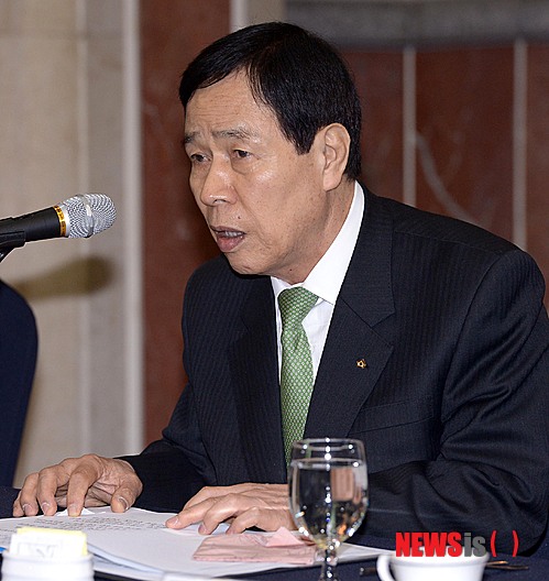 【서울=뉴시스】김인철 기자 = 16일 오후 서울 영등포구 여의도 렉싱턴호텔에서 열린 주택건설업계 초청 오찬간담회에서 김문경 대한주택건설협회 회장이 인사말을 하고 있다. 2014.04.16.