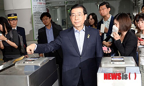 교통카드 이용해 개찰구 통과하는 박원순 후보