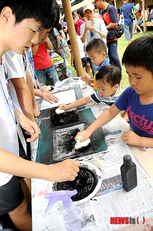 【서천=뉴시스】권교용 기자 = 21일 여름이면 더욱 사랑받는 한국 최고의 전통천연섬유축제인 ,‘제25회 한산모시문화제’가 충남 서천군 한산모시관 일원에서 개막된 가운데 축제장에 방문한 어린이들이 탁본 체험을 하고 있다. 2014. 06. 21.