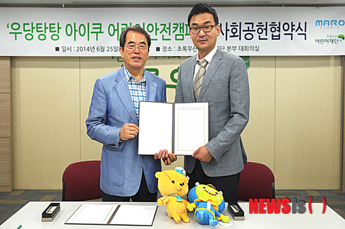 【서울=뉴시스】초록우산 어린이재단은 25일 서울 중구 어린이재단 회의실에서 ‘우당탕탕 아이쿠’ 애니메이션을 제작한 마로스튜디오와 어린이안전캠페인 협약을 체결했다. 이제훈(왼쪽) 어린이재단 회장과 마로스튜디오 박일호 대표가 기념촬영을 하고 있다. 2014.06.25. (사진=초록우산 어린이재단 제공)