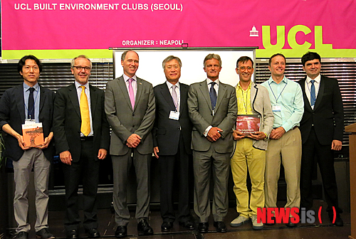 왼쪽부터 서경욱 경기대학교 건축학과 교수, 마틴 프라이어 주한영국문화원장, 스콧 와이트먼 주한영국대사, 이경회 연세대학교 명예교수, 데이비드 콥 UCL 건축대학 비지니스개발팀장, 마코스 크로스 교수, 벤 크록스포드 교수, 스텔리오스 플레이니오티스 사장. 2014.07.03.(사진=영국대사관 제공)