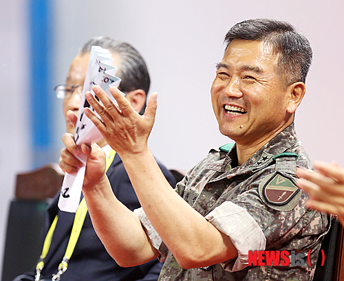 【인천=뉴시스】8일 오후 인천 삼산월드체육관에서 펼쳐진 '2014 인천세계휠체어농구선수권대회' 대한민국과 일본 경기를 찾은 육군 17사단 송유진(오른쪽) 사단장이 대한민국을 응원하고 있다. 2014.07.08. (사진=한국포토저널 제공)